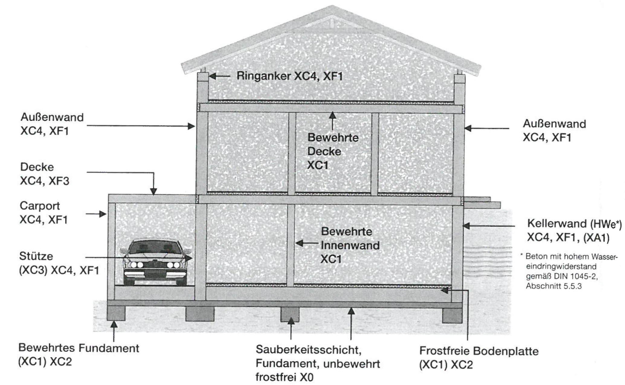 | 2 | XC | Innenbauteile, Gründungsbauteile oder mit hoher Luftfeuchte (Wäschereien, Schwimmbad, Ställe), offene Hallen |