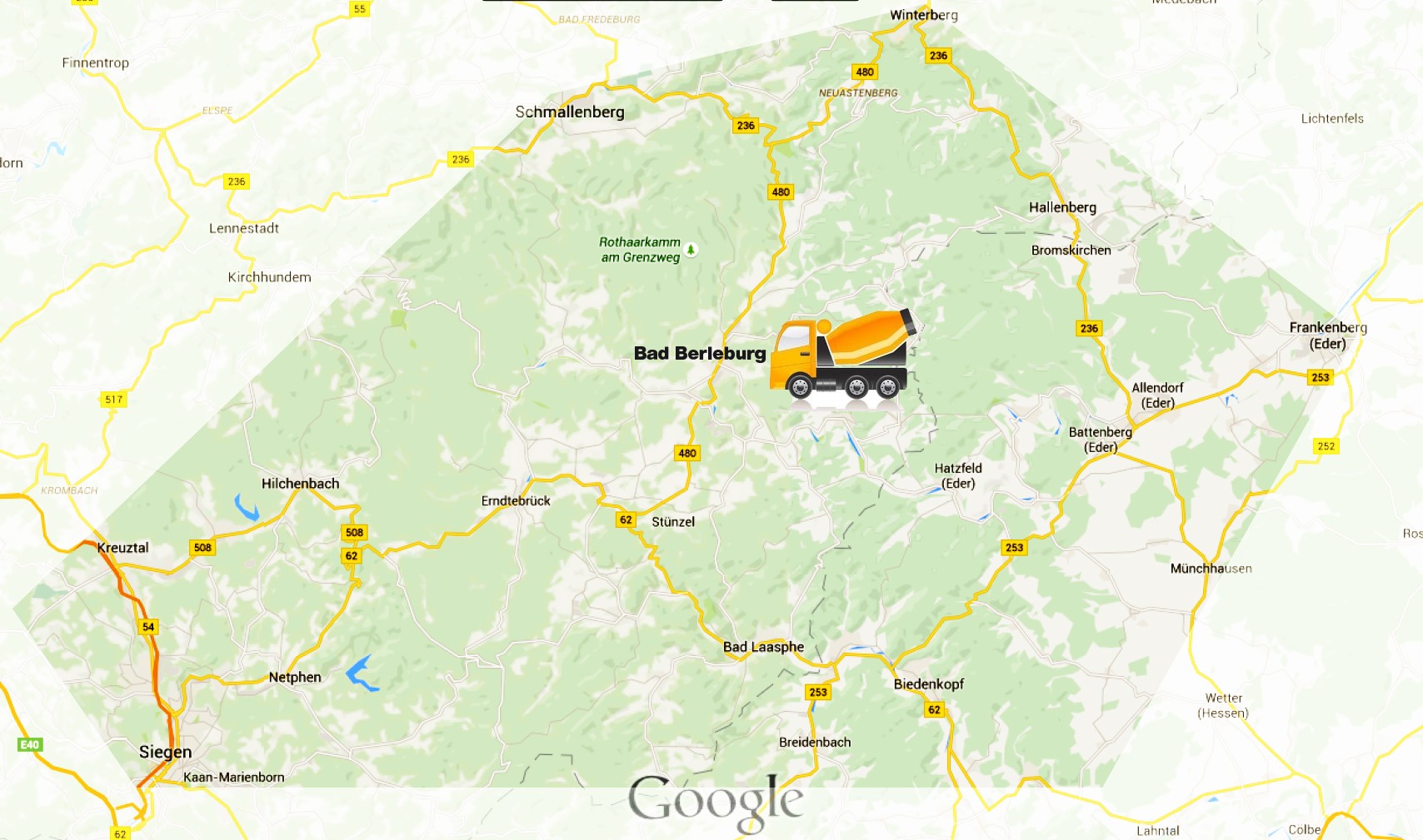 Unser Transportbeton zu Ihrer Baustelle – Wir beliefern neben Bad Berleburg auch die Gemeinden Erndtebrück, Schmallenberg, Bad Laasphe, Kirchhundem, Winterberg, Hatzfeld, Biedenkopf, Bromskirchen, Hallenberg, Breidenbach, Lennestadt, Hilchenbach, Battenberg (Eder), Allendorf (Eder), Burgwald, Frankenberg (Eder), Netphen, Siegen, Münchhausen, Dietzhölztal, Steffenberg, Dautphetal, Wetter (Hessen), Meschede, Eschenburg, Rosenthal, Gladenbach, Kreuztal, Bad Fredeburg, Cölbe mit Beton.